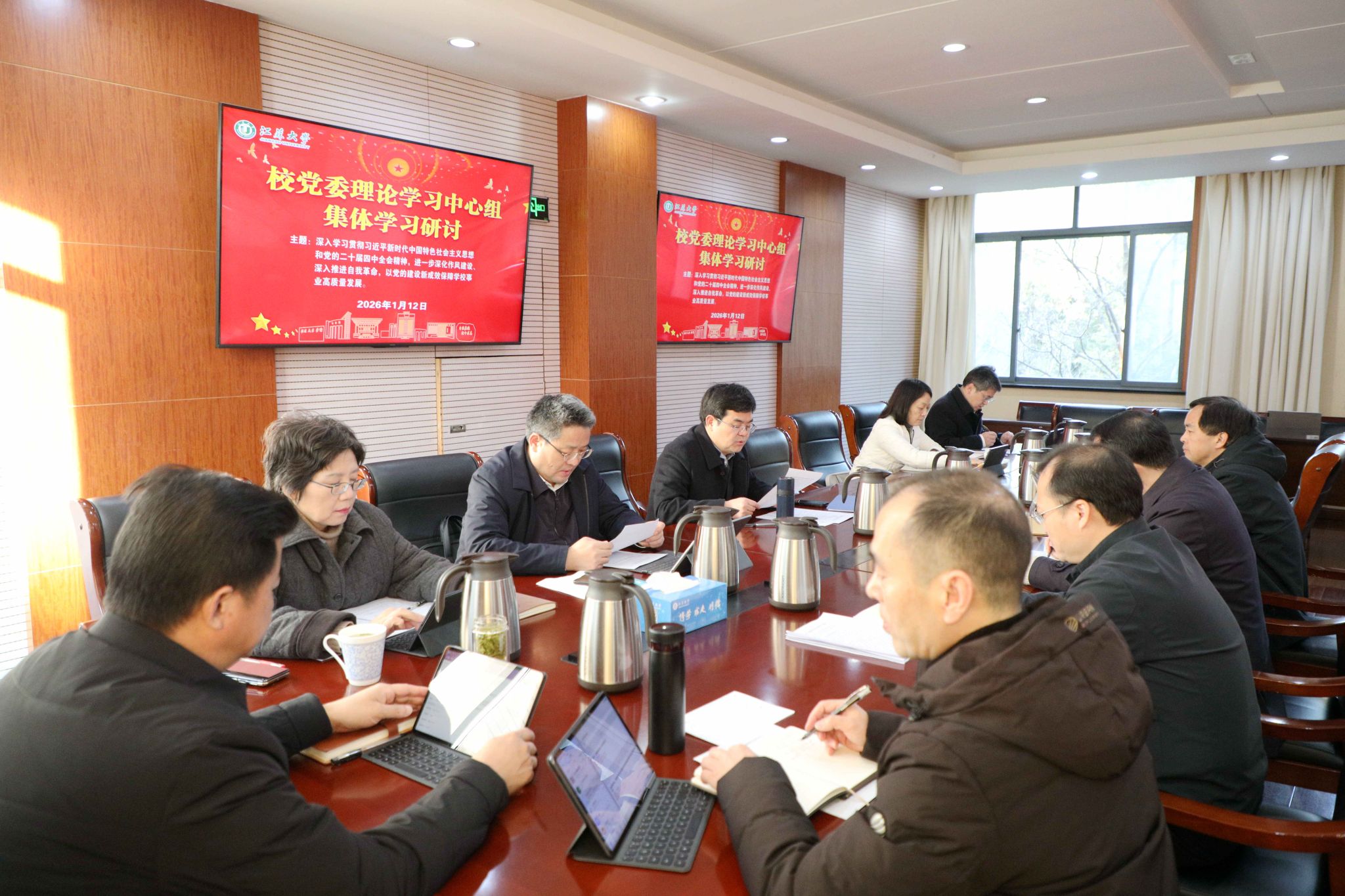 1月12日,校党委理论学习中心组在行政一号楼201会议室围绕“深入学习贯彻习近平新时代中国特色社会主义思想和党的二十届四中全会精神,进一步深化作风建设、深入推进自我革命,以党的建设新成效保障学校事业高质量发展”主题开展1月份集体学习研讨暨党委领导班子民主生活会前专题学习。全体校党委理论学习中心组成员参加学习,集体学习研讨由校党委书记李洪波主持。