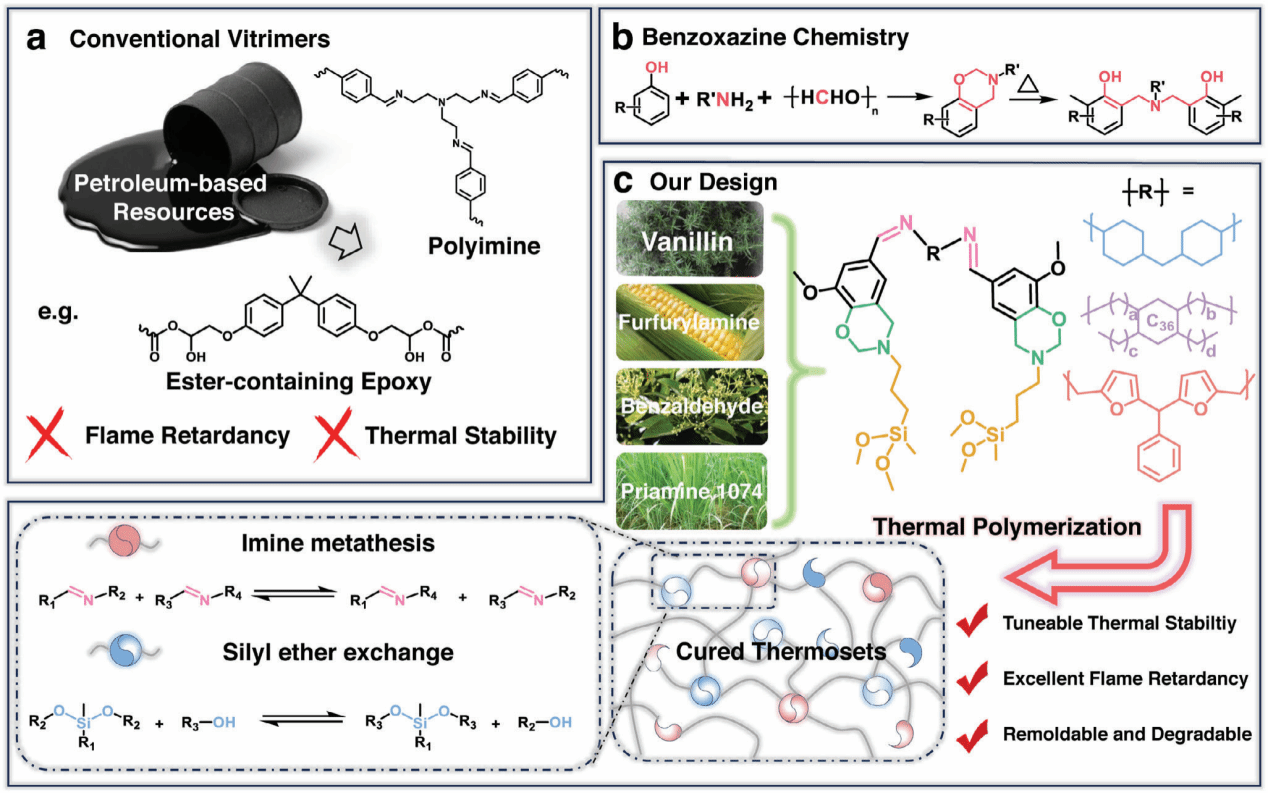 类玻璃体作为兼具力学强度、可加工与可降解性的新兴材料,近年来在高分子科学领域备受关注。然而,传统类玻璃体材料普遍存在合成原料不可持续、低耐热、易燃等多重技术瓶颈,严重制约其在航空航天、电子封装等高端领域的应用。针对上述挑战,研究团队基于苯并噁嗪灵活的分子可设计性,首次构筑了含亚胺与硅醚双重动态共价键的聚苯并噁嗪交联网络。以生物基香草醛和二胺为原料,通过分子层面精准合成同时含亚胺键与硅醚键的苯并噁嗪单体,成功制备出一类兼具高耐热、本征阻燃、可回收以及可降解特性的全生物基聚苯并噁嗪类玻璃体。该材料展现出卓越的综合性能,其10%热失重温度高达361.7 ℃,炭化率为 61.4%,阻燃等级达到UL-94 V-0级,极限氧指数高至31.2%,且可在碱性条件下6小时内实现完全降解。机理研究表明,亚胺键作为“牺牲单元”在碱性条件下优先断裂,赋予材料快速降解能力;硅醚键则兼具高温可交换性与燃烧成炭特性,既可保障材料重复加工性能,又能在燃烧时原位生成致密二氧化硅保护层,协同发挥凝聚相阻燃与气相抑燃双重机制。基于苯并噁嗪化学的双重动态共价键协同效应首次实现了高热稳定、本征阻燃、可重塑、可降解四种竞争性能的统筹兼顾。