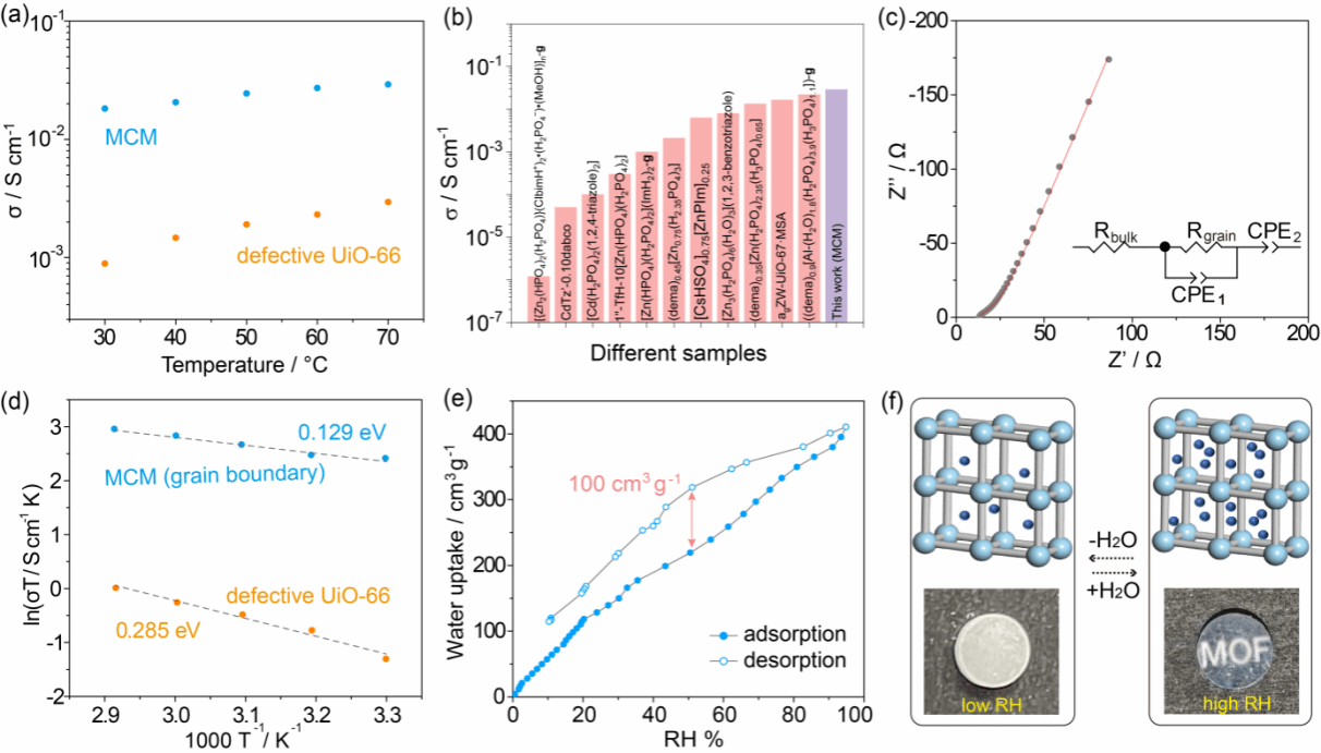 该MOF陶瓷膜展现出两项卓越性能。其一为超高质子传导:致密的亲水晶界构建了高效的质子传输“高速公路”,其质子电导率在70°C、100%相对湿度下达2.91×10-2 S cm-1,媲美商业Nafion膜。其二为湿度响应光学透明性:干燥时膜不透光;高湿环境下,水分子优先填充晶界,折射率匹配效应使膜在可见光区透光率高达75%,接近普通玻璃;这一透明-不透明的转变完全可逆且循环稳定。