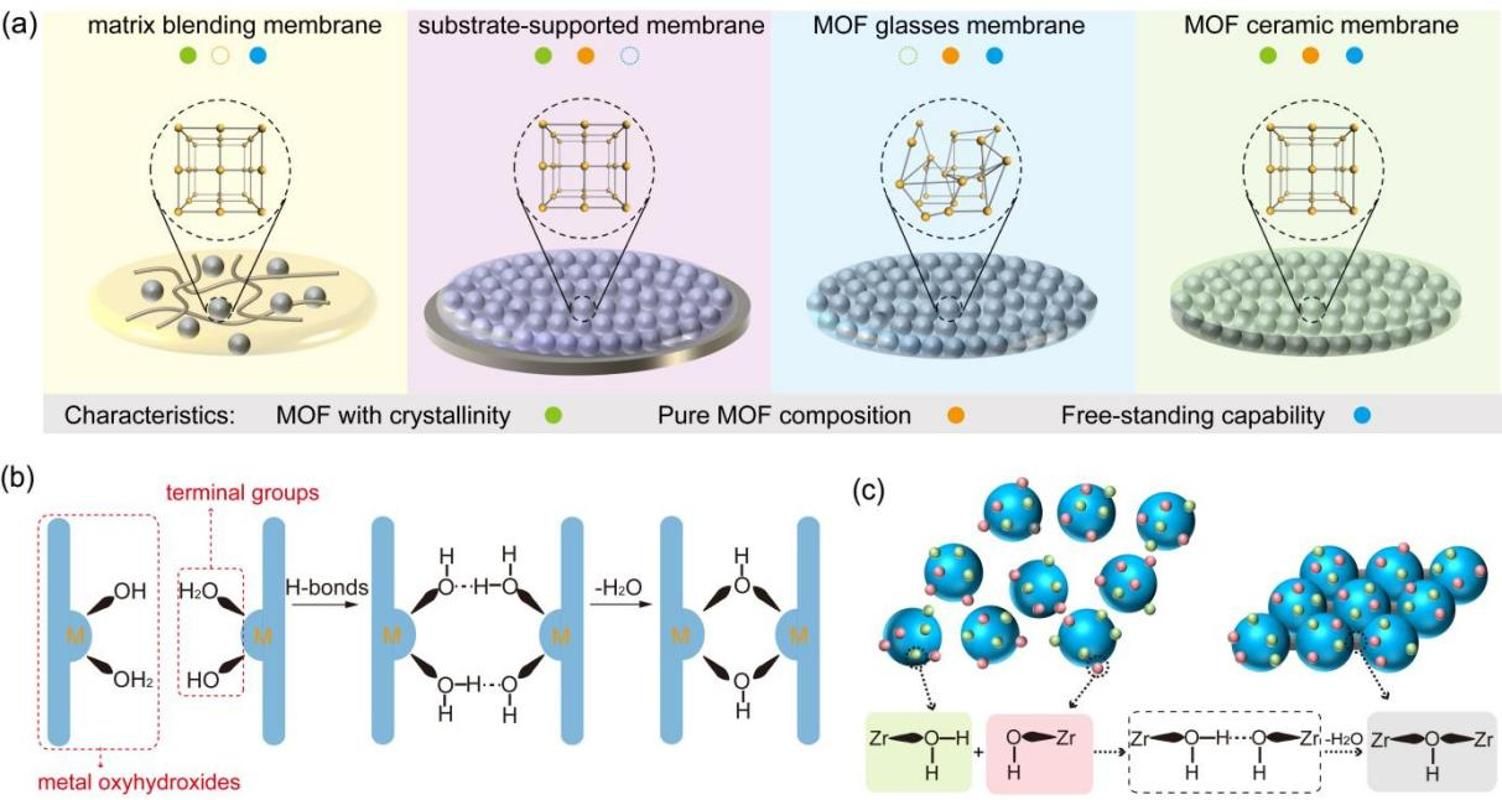 在该研究中,研究人员受自然界金属氧化物通过羟基(-OH)桥接并团聚的启发,创新性地提出一种“OH桥接”策略。通过冷压法对富缺陷MOF纳米晶进行桥联反应,成功将纳米颗粒“焊接”成一种全新的、自支撑的MOF陶瓷膜。该膜不仅完美保留了MOF的晶态结构和本征孔道,更在颗粒间形成了致密且亲水的晶界。