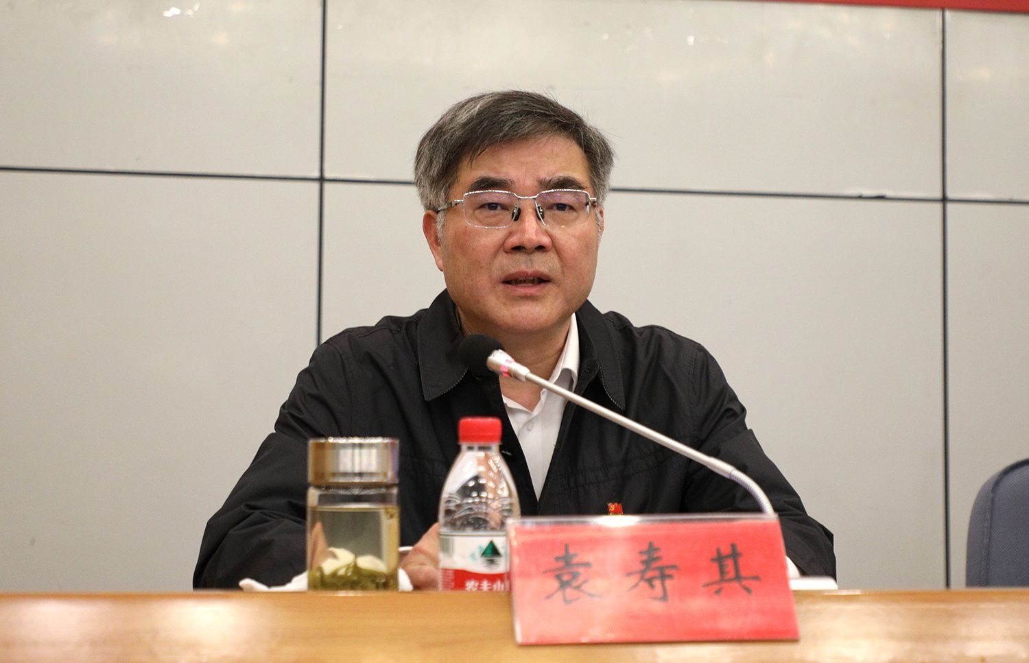 袁寿其指出,在全党深入开展学习贯彻习近平新时代中国特色社会主义思想主题教育,是党中央为全面贯彻党的二十大精神、动员全党同志为完成党的中心任务而团结奋斗所作的重大部署,是深入推进新时代党的建设新的伟大工程的重大部署。全校各级党组织和党员、干部要以高度的政治自觉、严肃的政治态度、饱满的政治热情,高起点谋划、高标准推进、高质量落实,确保主题教育走深走实。一要聚焦凝心铸魂,强化理想信念,自觉在强化思想理论武装方面走在前、作表率,筑牢信仰之基、补足精神之钙、把稳思想之舵;二要聚焦锤炼党性,强化政治忠诚,切实做到真心爱党、时刻忧党、坚定护党、全力兴党;三要聚焦促进发展,强化实干担当,引领广大党员、干部和师生驰而不息抓落实,立足岗位作贡献,以更好成效、更大进展续写贯彻落实习近平总书记重要批示精神的优秀答卷;四要聚焦为民造福,强化宗旨意识,以“干、实干、努力干、创造性干、竭尽全力干、领导干部带头干”的实际行动持之以恒为师生办实事、做好事;五要聚焦政治本色,强化廉洁自律,教育引导广大党员干部增强纪律意识、规矩意识,推动形成清清爽爽的同志关系、规规矩矩的上下级关系,争做遵纪守法、清正廉洁的表率。