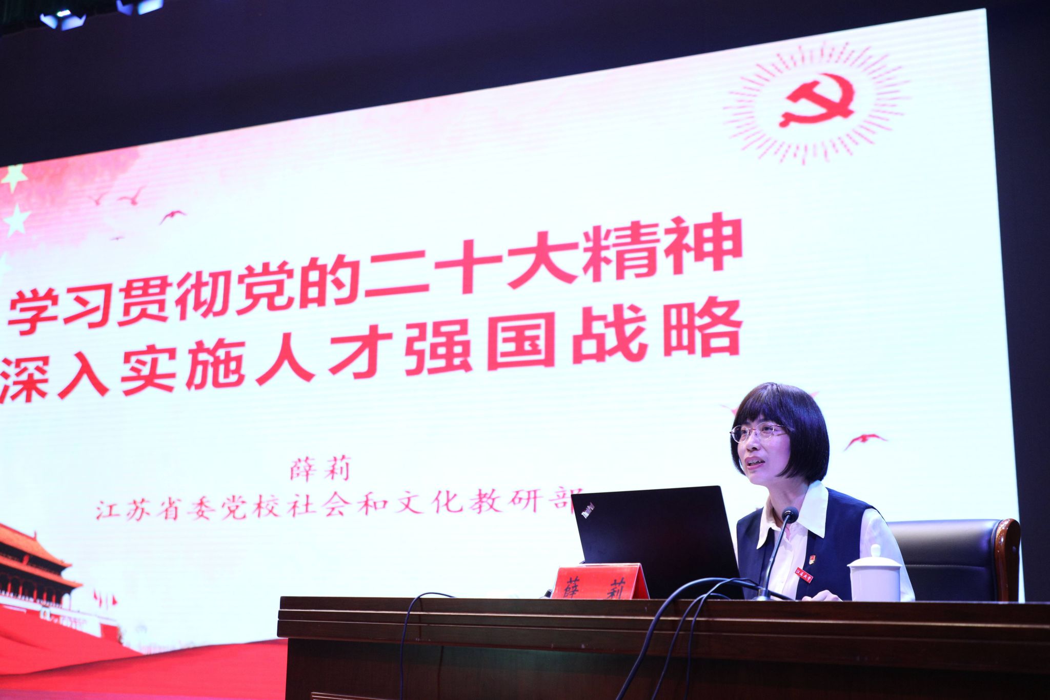 4月17日,省委党校教授、beat365官网客座教授薛莉应邀到校,在校本部小礼堂作题为《学习贯彻党的二十大精神——深入实施人才强国战略》的专题报告。全校处级领导干部参加了报告会,会议由校党委常委、组织部部长马志强主持。