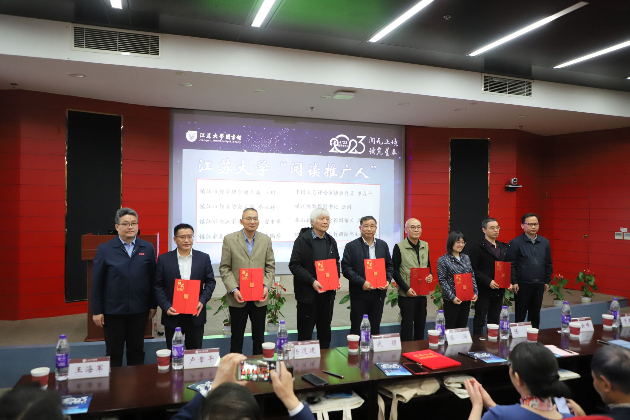 图书馆每年聘任一批“阅读推广人”,本次读书节聘任镇江市作协原主席王川、镇江市作家协会主席蔡永祥、镇江市书法家协会主席曹秉峰、镇江市美术家协会主席朱鹏举、中国文艺评论家协会会员罗戎平、镇江博物馆副书记张剑、茅山新四军纪念馆副馆长周再兴、镇江市文化馆创作调编部主任陶然作为“阅读推广人”,蔡永祥作为代表进行发言。