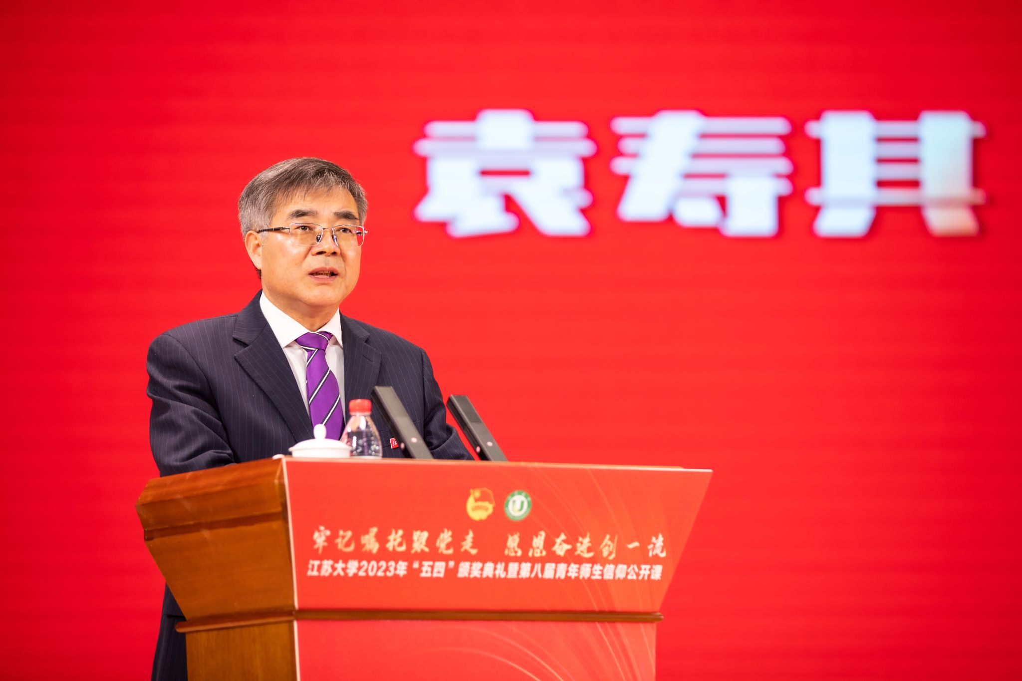 袁寿其在典礼上讲话,向全校团员青年提出三点希望。一要以青春之信仰逐梦新时代,做永跟党走的忠实传人。要深入学习党的创新理论,从内心深处厚植对党的信赖、对中国特色社会主义的信心、对马克思主义的信仰,坚定不移听党话、跟党走,切实把青春理想融入到党和人民的事业中,做有志气、有追求、有抱负的新时代青年。二要以青春之奋斗扬帆新征程,做本领过硬的时代先锋。要以先进为榜样,立大志、下大力、成大才、担大任,在新征程上成就最好的自我、一流的人生。三要以青春之作为扛起新使命,做挺膺担当的复兴栋梁。要传承好、发扬好江大人的“精神衣钵”,到祖国最需要的地方去,到现代化建设和乡村振兴的最前沿,把最好的论文写在祖国大地上,不负党的嘱托、不负青春韶华,努力成长为各行业的“弄潮儿”,创造出这一代江大人的青春业绩。