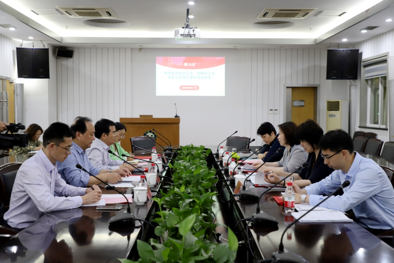 5月17日,省总工会副主席张迎春、省教育科技工会主席寇芳一行在镇江市总工会副主席解军英的陪同下来beat365官网调研指导工作,校党委副书记李洪波、工会常务副主席沈良钧等参加会议。