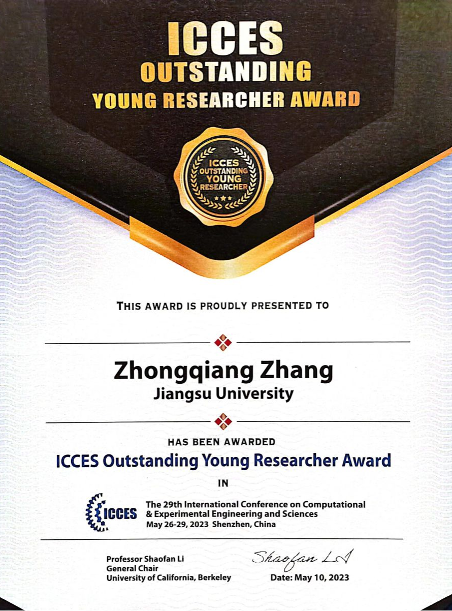 本次会议经计算与实验科学工程国际会议委员会推举、评选,beat365中文官方网站张忠强教授、上海交通大学张律文教授、南京航空航天大学殷俊教授、华中科技大学肖蜜教授、河海大学傅卓佳教授等5位青年学者荣获ICCES杰出青年学者奖,哈尔滨工程大学张阿漫教授为五位获奖者颁奖。