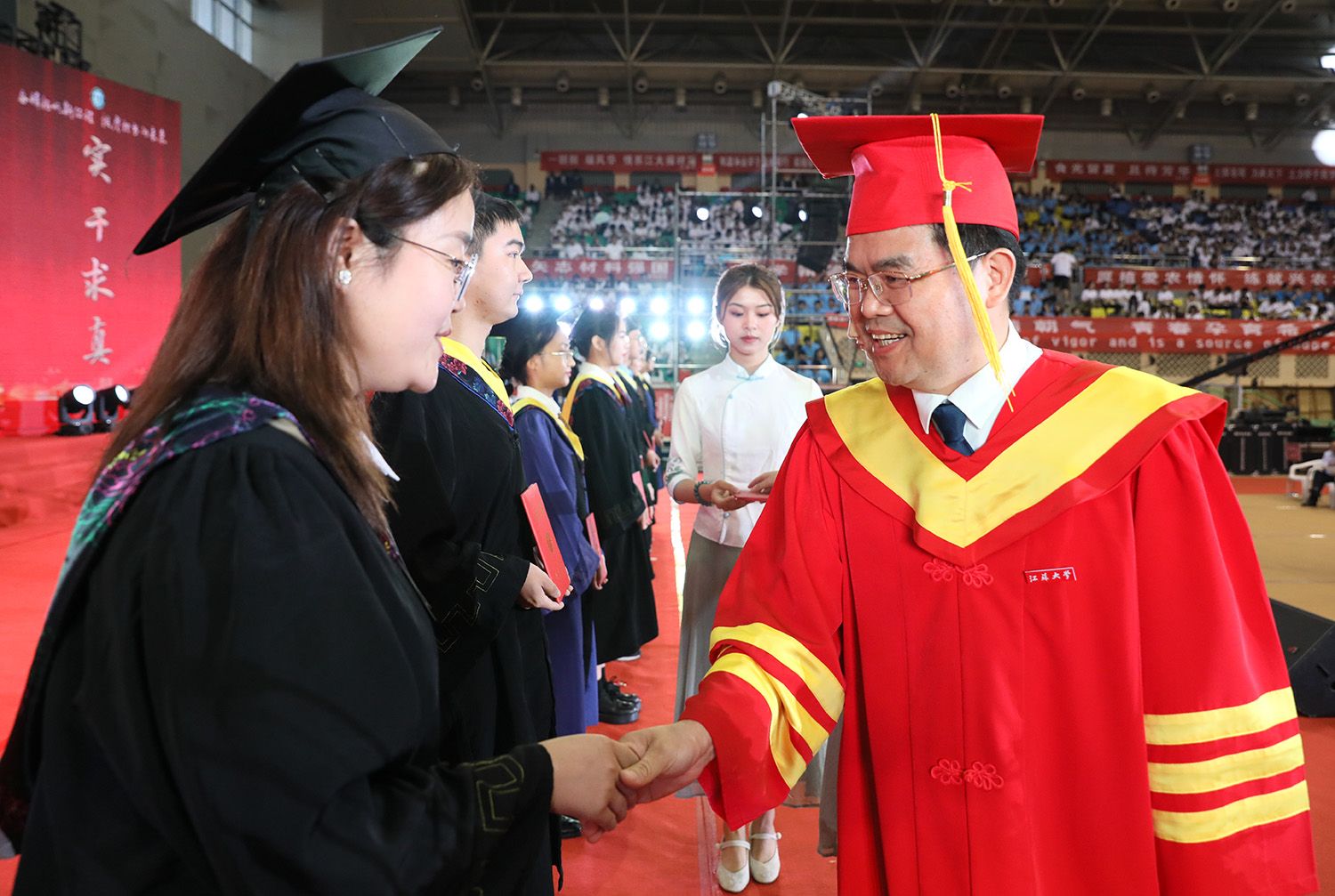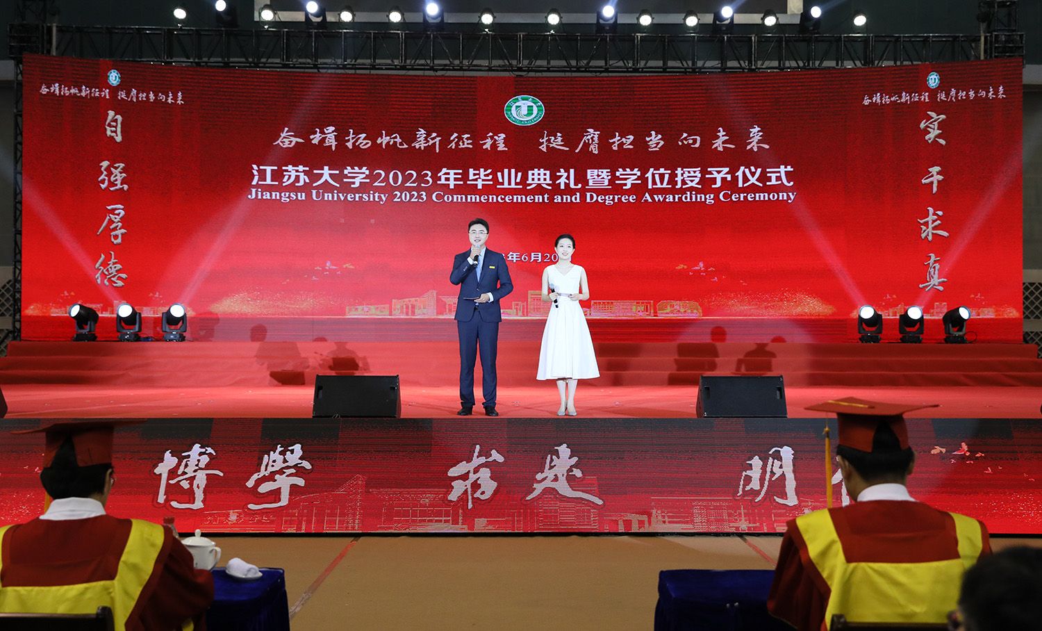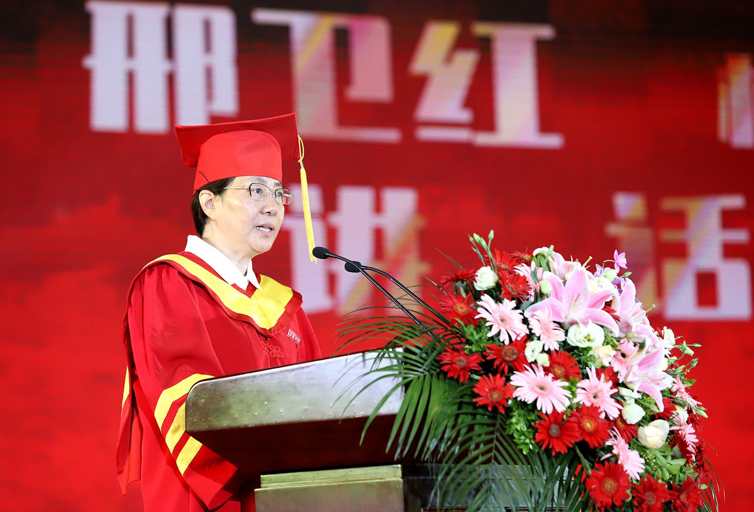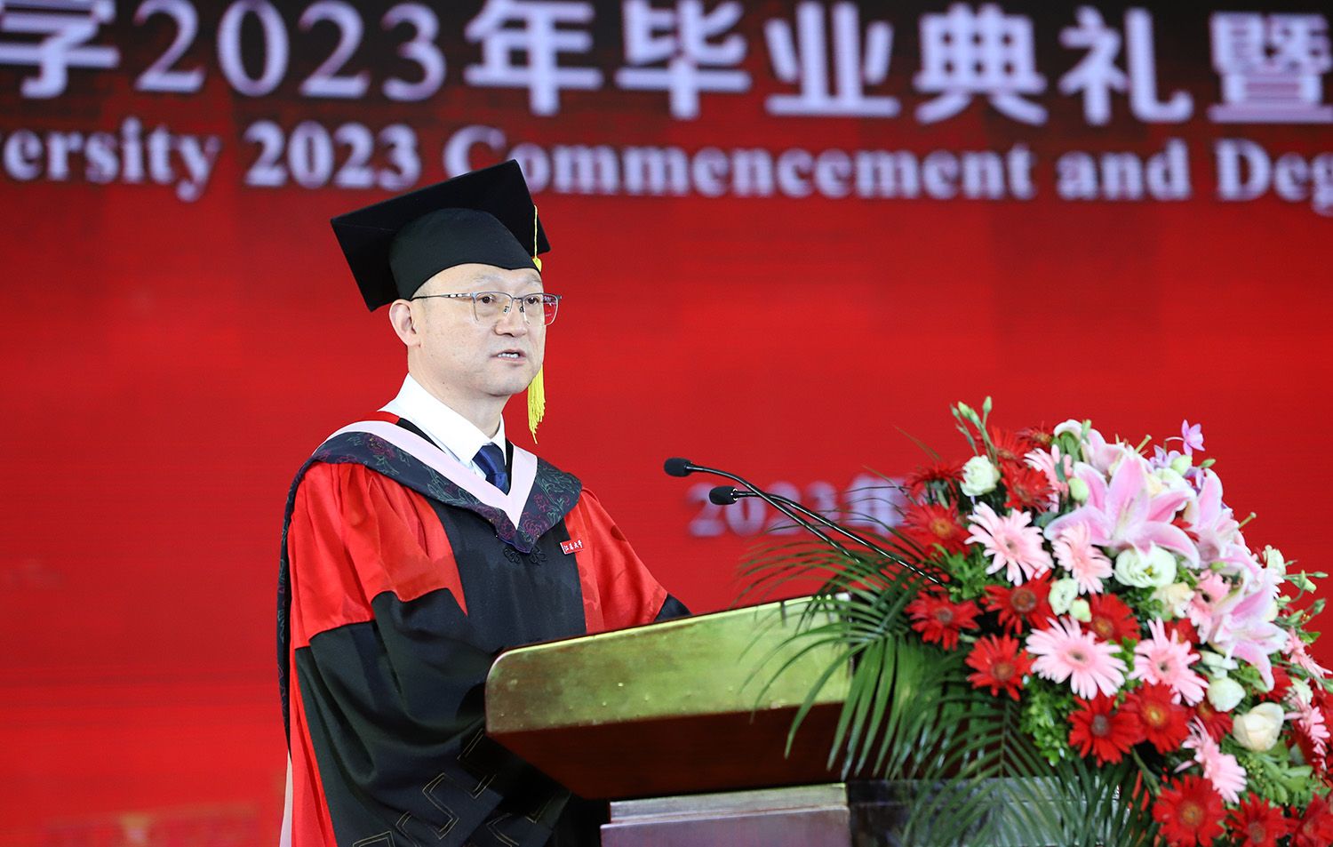 校长邢卫红发表题为《经风历雨 奔赴山海》的讲话。她代表学校向全体毕业生致以热烈的祝贺。邢卫红说,2023届毕业生是特殊的一届毕业生,经历了3年多新冠疫情的考验,铸就了包容坚毅的品格气质,体现了江大青年的责任担当,取得一个又一个骄人的成果。邢卫红说,矢志奋斗、砥砺前行的精神品格已然成为2023届毕业生的共同坚守,相信优秀的同学们终将造就更加优秀的江大。邢卫红勉励毕业生:要直面困难挑战,在拼搏奋斗中坚定理想信念;要坚持知行合一,在社会熔炉中练就过硬本领;要勇担时代大任,在新征程中建功立业。邢卫红希望毕业生在强国复兴伟大征程中续写江大故事、贡献江大力量、彰显江大影响,并祝愿大家在奔赴人生下一场“星辰大海”的路上,所见皆美好,所得皆所愿。