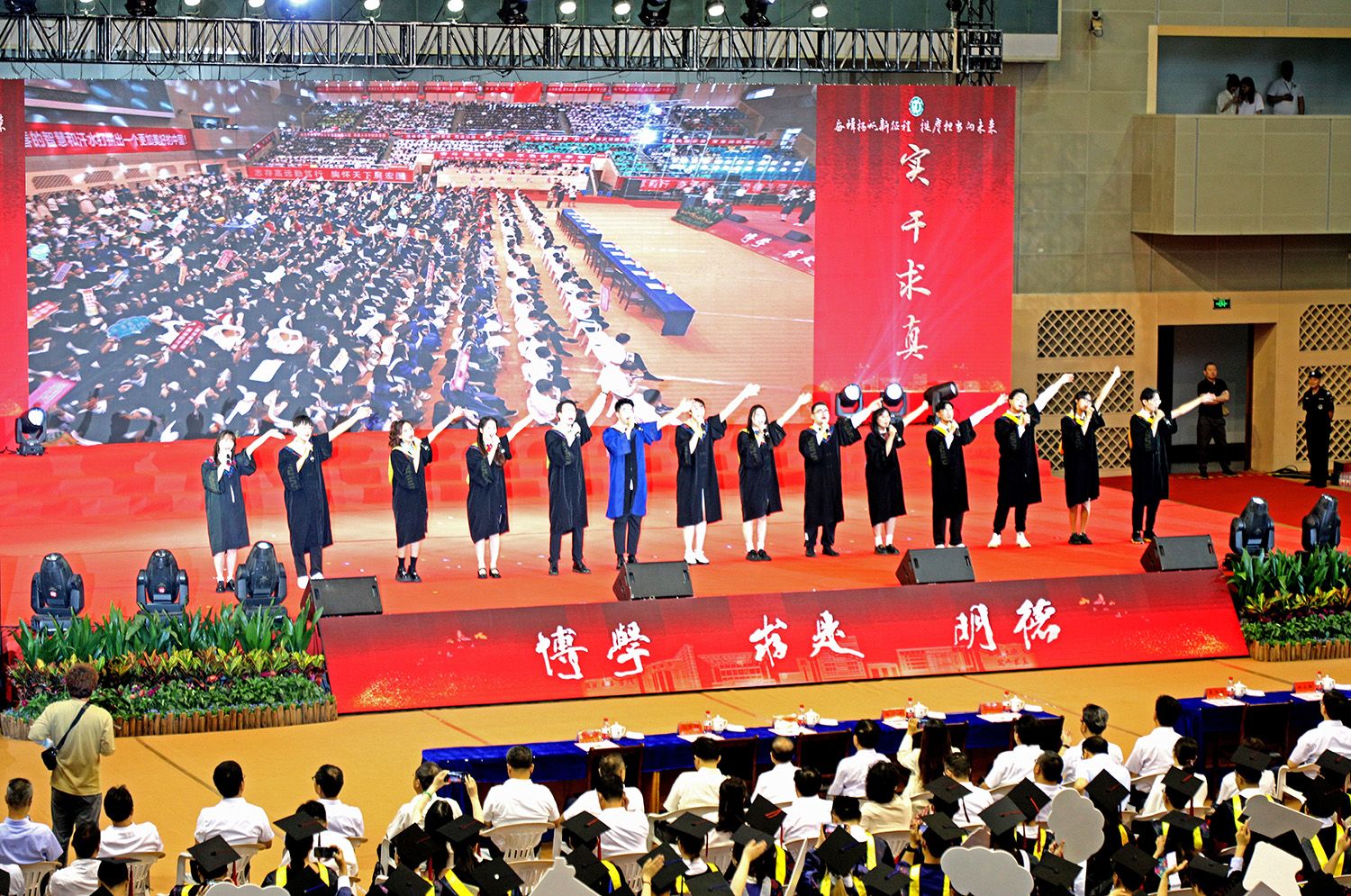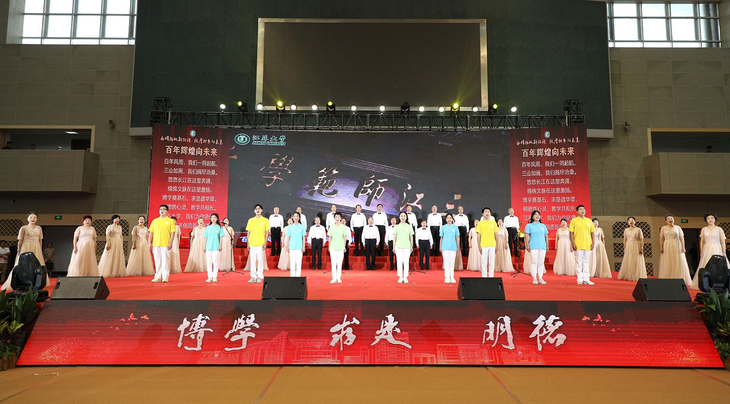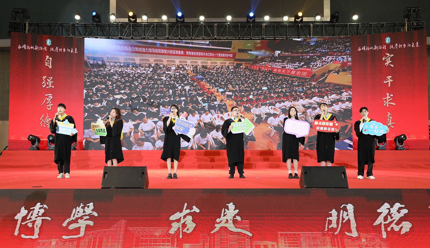 典礼上,师生代表表演了情景朗诵《最美的遇见》和合唱《星辰大海》,祝福全体毕业生带着美好的回忆,奔赴祖国各地继续追梦。典礼最后,全场起立,齐唱校歌《百年辉煌向未来》,表达对学校的真挚祝福和对学子的美好祝愿。