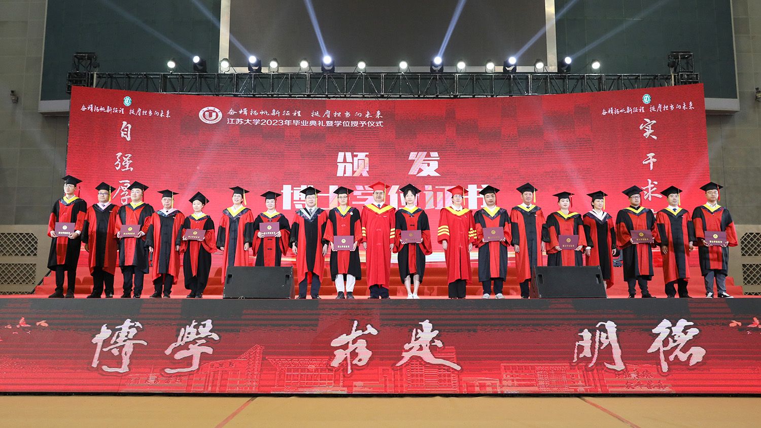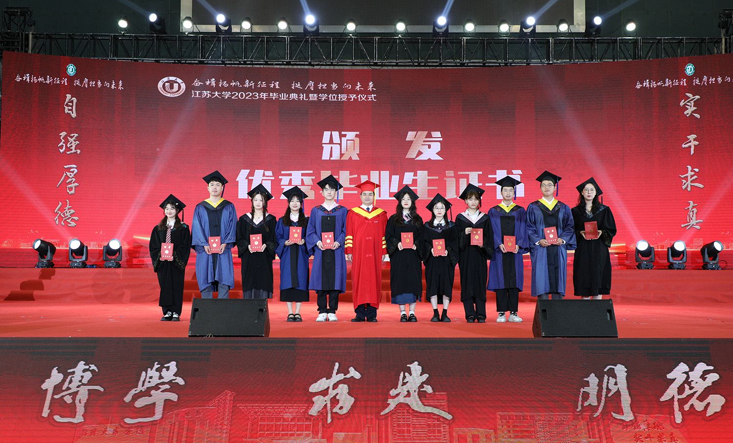 在学位授予仪式上,校领导、校党委常委为博士、硕士、学士学位代表颁发学位证书并扶正流苏。部分因疫情错过线下毕业典礼的2020、2021、2022届毕业生重返母校,校领导、校党委常委为他们颁发学位证书并扶正流苏。校党委书记李洪波为优秀毕业生代表颁发荣誉证书。