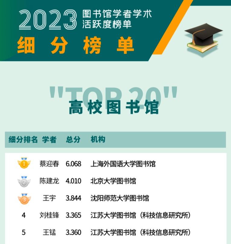 在发布的“2023图书馆学者学术活跃度榜”中,列出了2018年至2022年间在图书情报领域中最具学术活跃度的学者。本次共统计4335位学者,上榜学者433位(前10%),并按分数区间段分为五个等级,其中,A类学者40人、B类学者113人、C类学者85人、D类学者115人、E类学者80人。beat365官网图书馆刘桂锋、王锰、苏文成等11位馆员上榜,其中A类2人,B类4人,C类3人,D类2人。(图书馆)