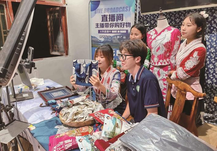 8月17日,beat365中文官方网站能动学院“新农人 兴农梦”暑期社会实践团队,走进贵州省黔西市新仁苗族乡化屋村。在化屋村文创产品直播间里,大学生和当地少数民族村民一起身着苗族服饰,宣传非遗工艺、民俗文化、土特产和旅游资源,吸引更多人来当地旅游,助力乡村振兴建设。