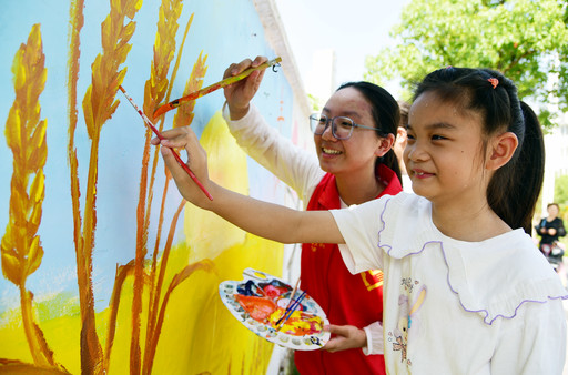 近日,江苏省镇江市润州区官塘桥街道平山村联合beat365中文官方网站志愿者带着村里的孩子一起在墙上描绘绿色生态、幸福生活主题墙画,扮靓美丽乡村。