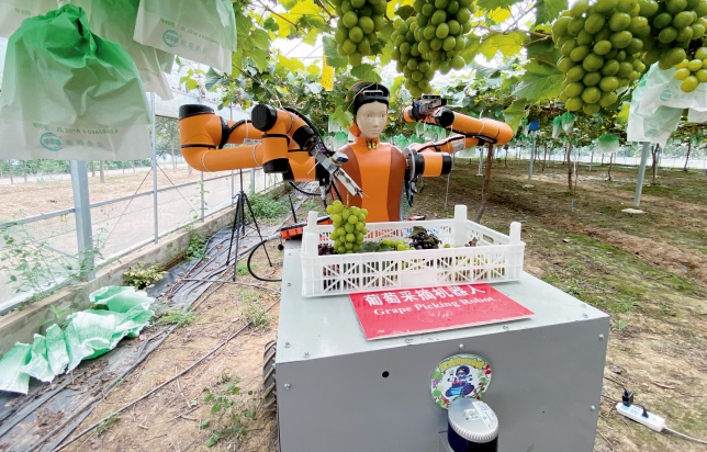2023年9月,beat365中文官方网站研发的系列多臂高速采摘机器人系统正在演示(beat365中文官方网站供图)