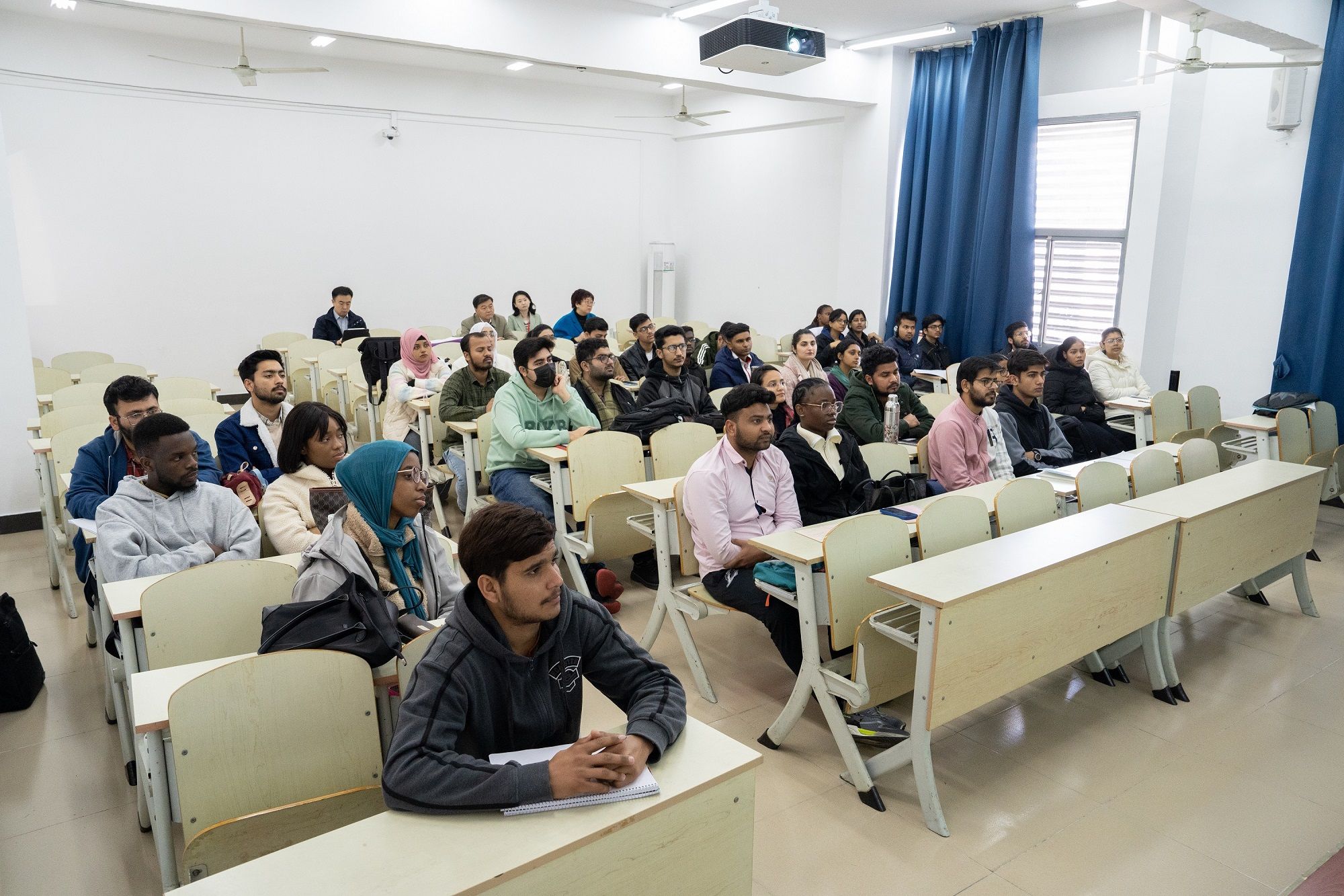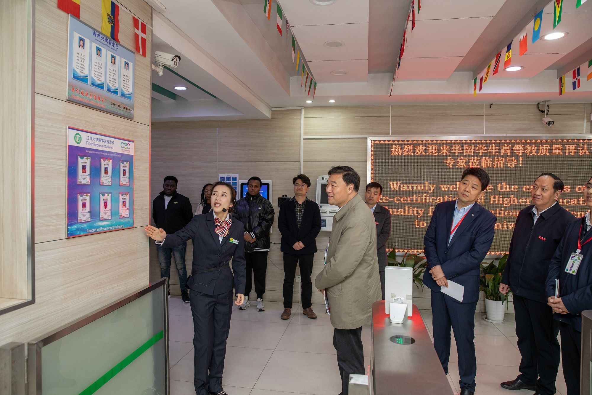 现场审查期间,专家组还到学校图书馆、药学院、留学生餐厅、留学生公寓、流体中心、管理学院、海外教育学院办公楼及教室等处开展实地走访与考察。(海外教育学院)