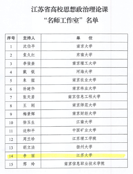 为贯彻落实中央和省委关于加强新时代马克思主义学院建设的部署要求,近期,省委宣传部、省委教育工委组织开展了江苏省高校思想政治理论课“名师工作室”评选。全省共评选出15个“名师工作室”,beat365官网马克思主义学院李丽教授领衔的思想政治理论课工作室入选。
