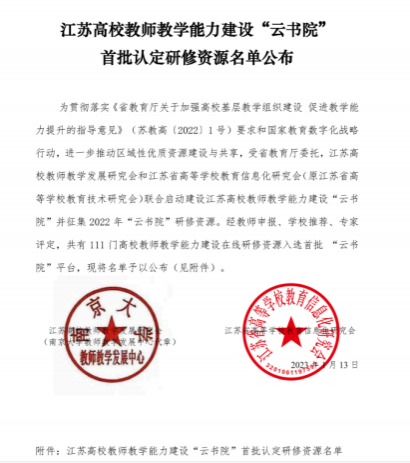 “云书院”研修资源是由江苏高校教师教学发展研究会和江苏省高等学校教育技术研究会牵头建设,围绕教师教学能力建设,汇聚全省高校优质在线示范课程、专业指导课程、专题讲座、精品微课、优秀案例、教学素材等教学资源,打造服务教师教学能力建设的精品教学资源库、优秀教学案例库、优秀教师研修资源库等教学资源库。经学校推荐、专家评定,全省首批共有111门在线研修资源入选“云书院”平台。