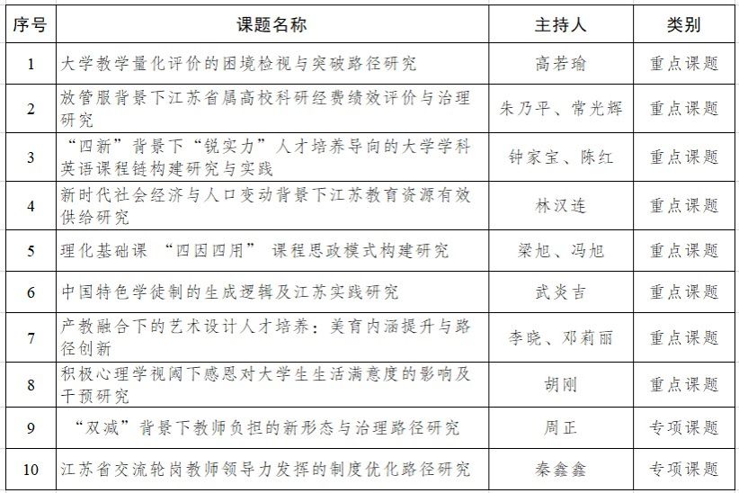 日前,江苏省教育科学规划领导小组办公室下发《关于公布2022年度省教育科学规划课题立项名单的通知》,公布了2022年度江苏省教育科学规划课题立项评审结果,beat365官网获批10个项目,总立项数位居全省高校前列。其中,重点课题8项、专项课题2项。