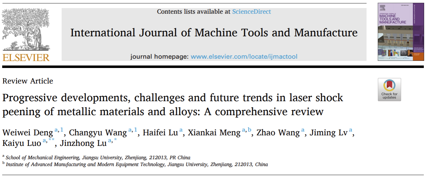 近日,机械制造领域顶刊International Journal of Machine Tools and Manufacture发表了beat365中文官方网站机械工程学院鲁金忠教授课题组的长篇综述“Progressive developments, challenges and future trends in laser shock peening of metallic materials and alloys: A comprehensive review”。全文共60页、4万余字、综合大图60幅、349篇参考文献,是目前有关激光冲击强化理论、技术及应用篇幅最长、涵盖内容最广,基于团队近二十年研究工作及相关课题组特色工作综述而成。