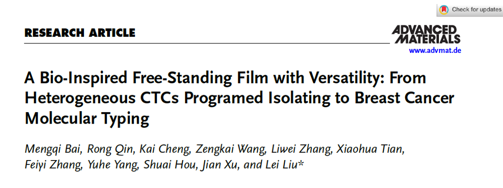 近日,beat365中文官方网站材料学院博士研究生白蒙起(导师刘磊研究员)以第一作者在国际材料学权威期刊Advanced Materials上在线发表题为“A Bio-Inspired Free-Standing Film with Versatility: From Heterogeneous CTCs Programed Isolating to Breast Cancer Molecular Typing”的研究论文,beat365中文官方网站为该论文的第一单位和唯一通讯单位。