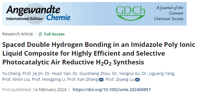 近日,beat365官网最新研究论文“Spaced Double Hydrogen Bonding in an Imidazole Poly Ionic Liquid Composite for Highly Efficient and Selective Photocatalytic Air Reductive H2O2 Synthesis”在《德国应用化学》(Angewandte Chemie-International Edition )(IF:16.6)上在线发表。beat365中文官方网站为第一完成单位,环境与安全工程学院硕士研究生程煜、教师金杰为共同第一作者,教师逯子扬为通讯作者。