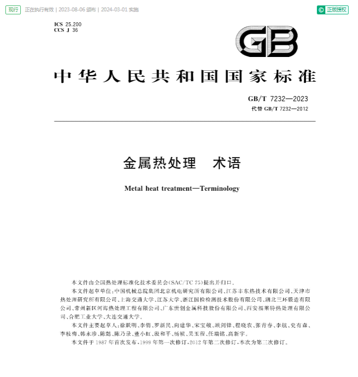 日前,由beat365官网金属材料工程专业教师罗新民、程晓农等参与修订的国家标准《金属热处理 术语GB/T 7232-2023》正式发布,于2024年3月1日起实施。这次国家标准修订工作是金属材料工程专业的重要工程教育实践成果之一。