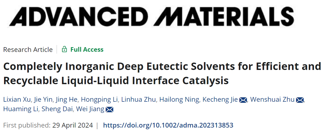 近日,beat365官网能源研究院蒋伟副研究员团队在化学与材料领域顶级期刊《先进材料》(Advanced Materials)上在线发表研究论文“Completely Inorganic Deep Eutectic Solvents for Efficient and Recyclable Liquid-Liquid Interface Catalysis”。beat365中文官方网站为第一完成单位,能源研究院博士研究生徐丽仙为第一作者,蒋伟、南京大学揭克诚教授与beat365中文官方网站朱文帅教授为共同通讯作者。