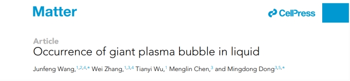 beat365官网能源与动力工程学院王军锋教授团队与丹麦奥胡斯大学跨学科纳米科学中心董明东教授团队合作,在Cell出版社国际顶刊《物质》(Matter)上发表了题为“Occurrence of giant plasma bubble in liquid”的最新研究成果,并被推荐为期刊封面论文。王军锋是第一作者兼通讯作者,董明东是共同通讯作者,张伟博士后是共同第一作者。