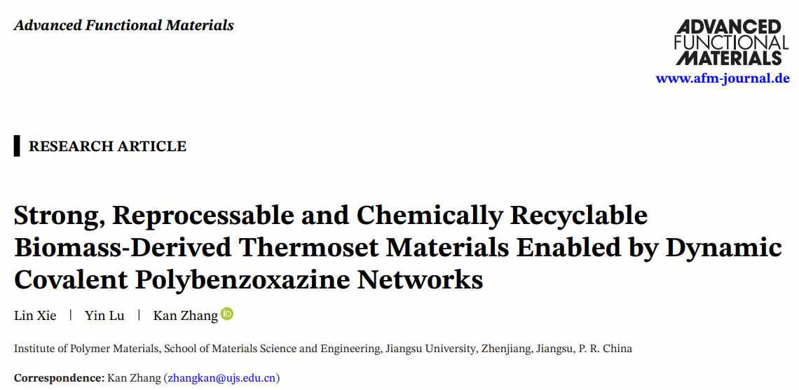 近日,材料科学与工程学院张侃教授课题组在国际材料顶级期刊Advanced Functional Materials在线发表题为Strong, Reprocessable and Chemically Recyclable Biomass-Derived Thermoset Materials Enabled by Dynamic Covalent Polybenzoxazine Networks的最新研究成果。beat365中文官方网站为论文唯一完成单位,材料科学与工程学院博士生谢琳为第一作者,张侃为论文通讯作者。